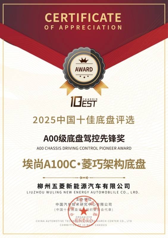 在最新揭晓的2025中国十佳底盘评选中,柳州五菱新能源旗下埃尚A100C·菱巧架构底盘凭借卓越性能脱颖而出,成为首个斩获"A00级底盘驾控先锋奖"的车型。这一突破性成就不仅开创了A00级车辆参与专业底盘评测的先河,更以技术实力重新定义了微型电动车的驾控标准。