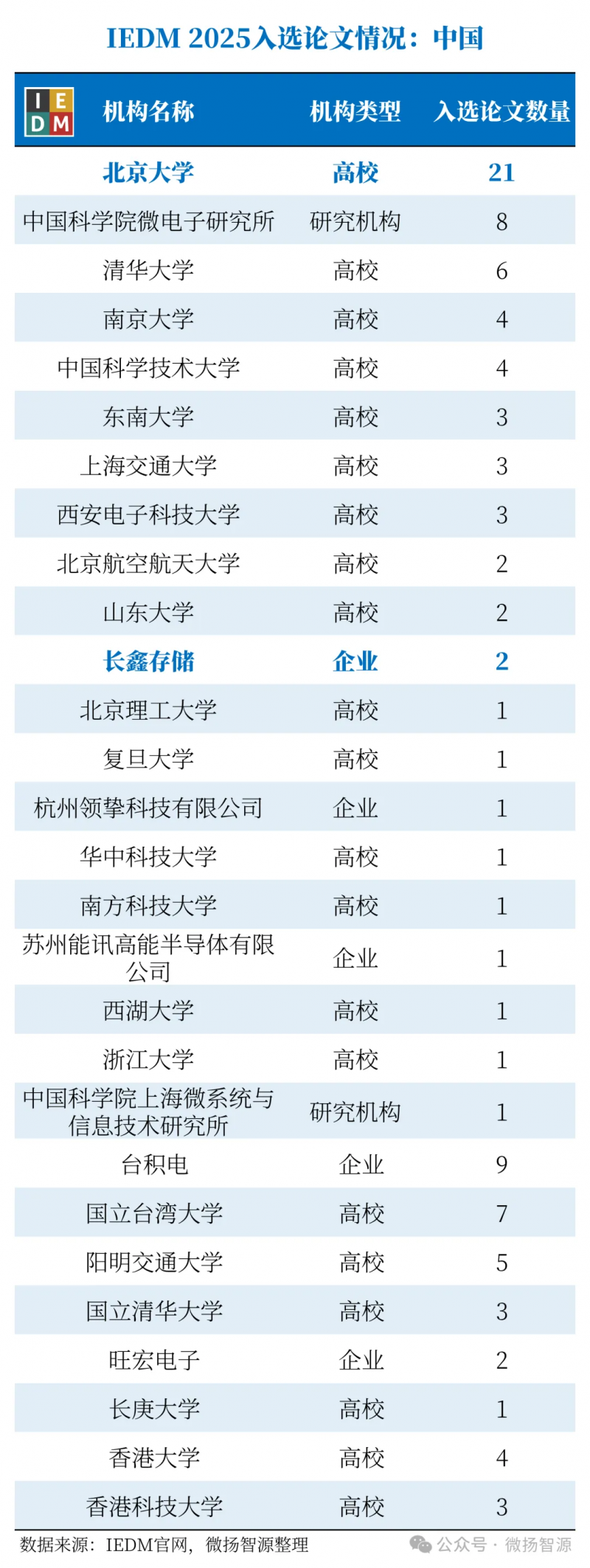 按照第一作者所在机构统计,中国内地的67篇论文来自20个机构。北京大学21篇(较去年增加6篇)、中国科学院微电子研究所8篇(较去年增加2篇)、清华大学6篇、南京大学(4篇)、中国科学技术大学(4篇)、东南大学(3篇)、上海交通大学(3篇)、西安电子科技大学(3篇)、北京航空航天大学(2篇)、山东大学(2篇)、长鑫存储(2篇)、北京理工大学(1篇)、复旦大学(1篇)、杭州领挚科技有限公司(1篇)、华中科技大学(1篇)、南方科技大学(1篇)、苏州能讯高能半导体有限公司(1篇)、西湖大学(1篇)、浙江大学(1篇)和中国科学院上海微系统与信息技术研究所(1篇)。其中,长鑫存储(CXMT)、杭州领挚科技有限公司、苏州能讯高能半导体有限公司(与小米通讯合作)集中展示了在存储、生命科学与射频等领域的最新突破,展现了中国半导体企业的创新实力。