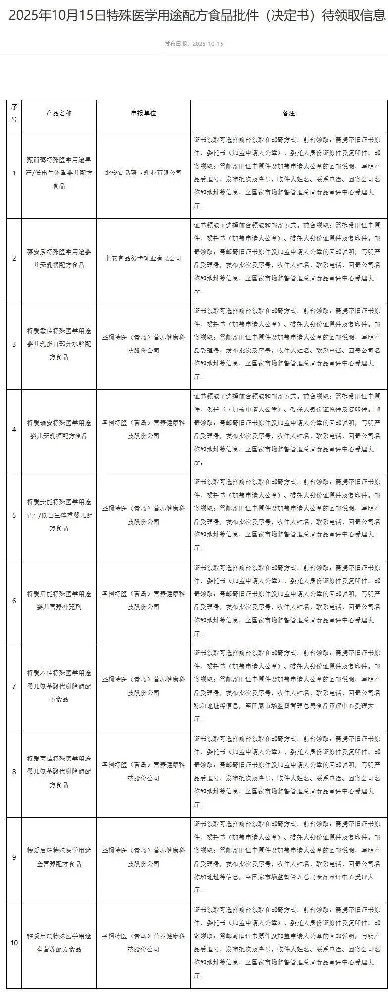 国家市场监督管理总局食品审评中心于近日公布了新一批特殊医学用途配方食品的批件待领取信息,此次共有10款产品通过审批,分别来自宜品与圣桐特医两家企业。这一消息为特殊医学用途配方食品市场注入了新的活力。