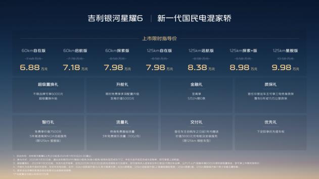 购车成本方面,星耀6以6.88万元的起售价切入主流市场,全系标配银河Flyme Auto智能座舱系统、神盾电池安全系统、棉花糖座椅、10.2英寸仪表盘及倒车影像等实用配置。相比同级车型,星耀6在价格更具竞争力的同时,配置水平实现越级提升,真正做到“好车不贵”。11月30日前下订并锁单的用户可享6000元超级置换金,叠加升舱礼、金融礼、质保礼等七重购车权益,进一步降低购车门槛。