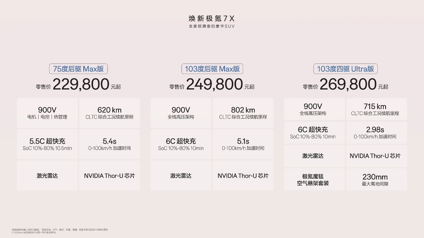 “全家都满意的豪华SUV”——焕新极氪7X正式登陆市场,推出三款配置车型,涵盖75度后驱Max版、103度后驱Max版及103度四驱Ultra版,官方指导价分别为22.98万元、24.98万元和26.98万元。在超级置换权益加持下,限时优惠价调整为21.98万元、23.98万元和25.98万元,为家庭用户提供更具吸引力的选择。