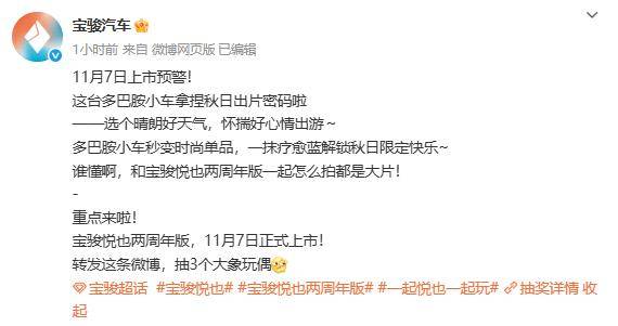 宝骏汽车近日宣布,旗下悦也车型将推出两周年特别版,并计划于11月7日正式上市。虽然官方尚未公布这款特别版车型的详细升级信息,但从发布的宣传海报中可以看出,新车采用了全新的雾霾蓝车身配色,搭配与车身同色的密辐式轮圈,整体视觉效果更加时尚动感。