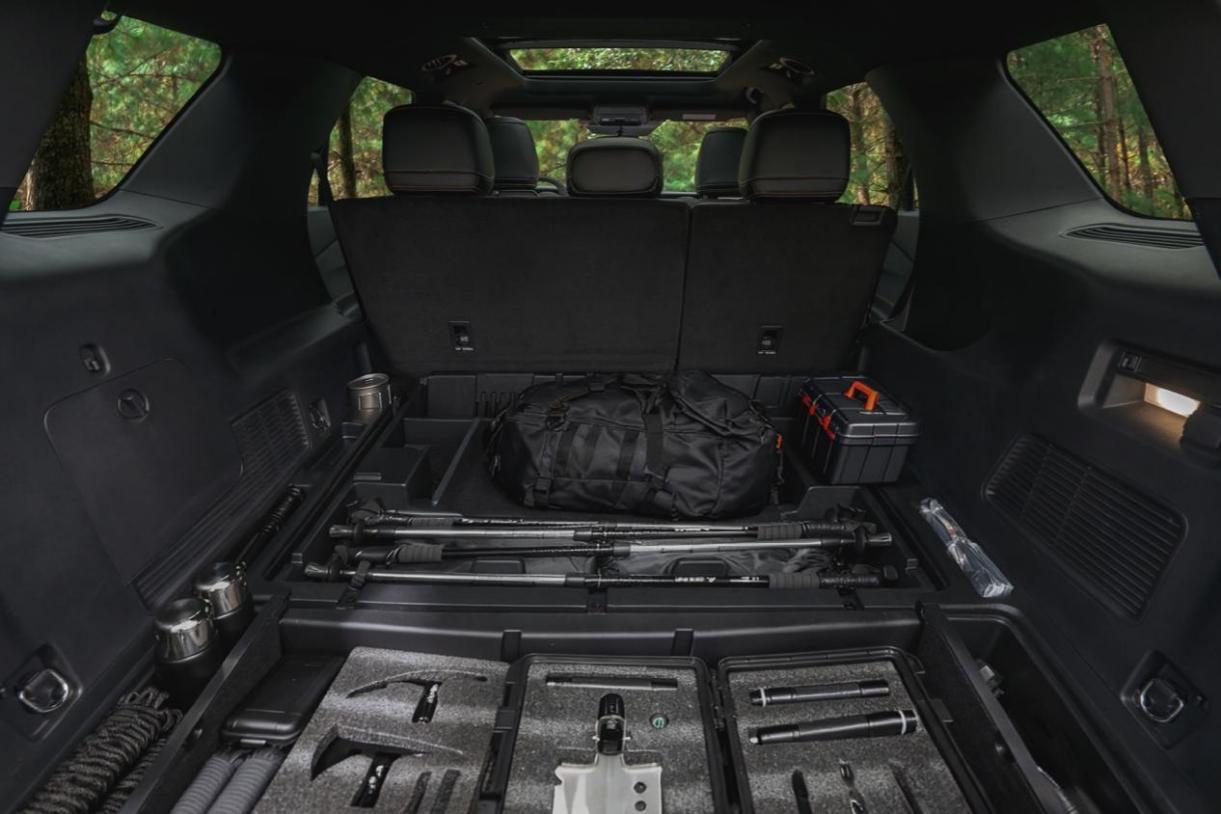 昆仑穿越版以五座布局直击户外储物痛点。常规状态下1505L的后备箱容积,可轻松容纳雪板、自行车等大件装备;第二排放倒后扩展至2487L的纯平空间,配合15个精细化储物格与可移动挡板设计,实现物品分类管理的灵活性。新增的置物板下隐藏储物盒额外拓展近100L空间,让帐篷、炊具等零散装备也能有序收纳。