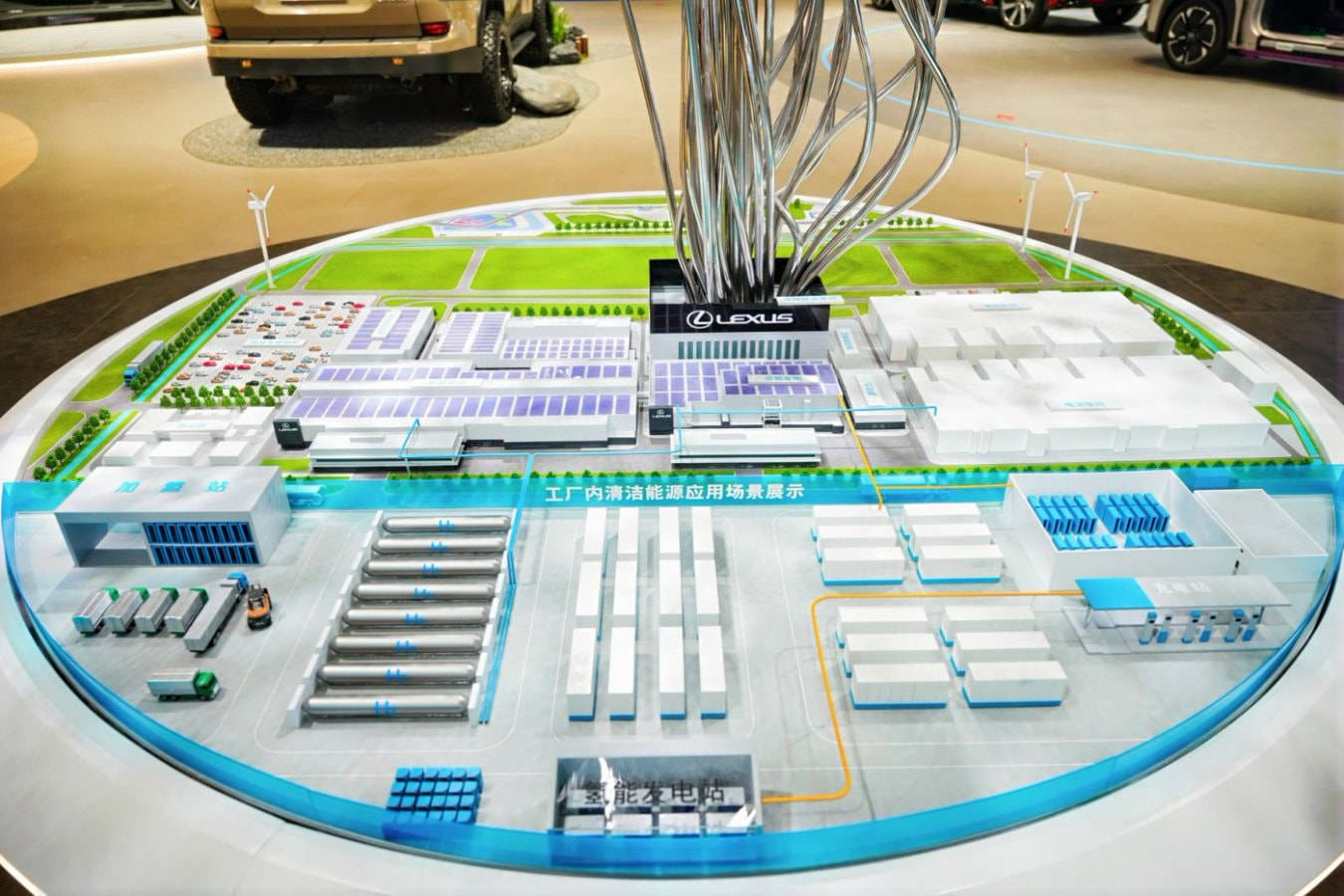 为全面呈现企业战略,丰田首次以沙盘形式展示全球工厂布局。其中国工厂将率先引入最先进生产技术,通过氢能应用打造碳中和生产基地,同时强调与社区环境的共生发展,践行“Best in Town”的可持续发展理念。