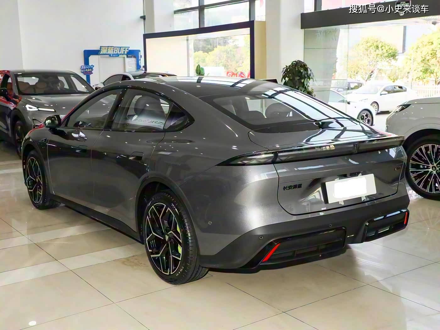 车身侧面是深蓝L06的视觉焦点。其长宽高分别为4830/1905/1480mm,轴距达2900mm,在中型车中优势显著,甚至比比亚迪秦L的轴距多出110mm。上扬的腰线从车头延伸至车尾,勾勒出“前低后高”的动感姿态,溜背式车顶线条如液态金属般流畅,既保留了轿跑的纯粹质感,又未过度牺牲头部空间。无框车门与半隐藏式门把手的组合堪称点睛之笔——门把手在靠近时自动弹出,离开后自动收回,既提升了仪式感,又让车身侧面更显简洁。实拍车型搭载的19英寸花瓣式轮毂搭配荧光绿刹车卡钳,进一步强化了运动氛围,而丰富的车身颜色选择,则能满足不同用户的个性化需求。