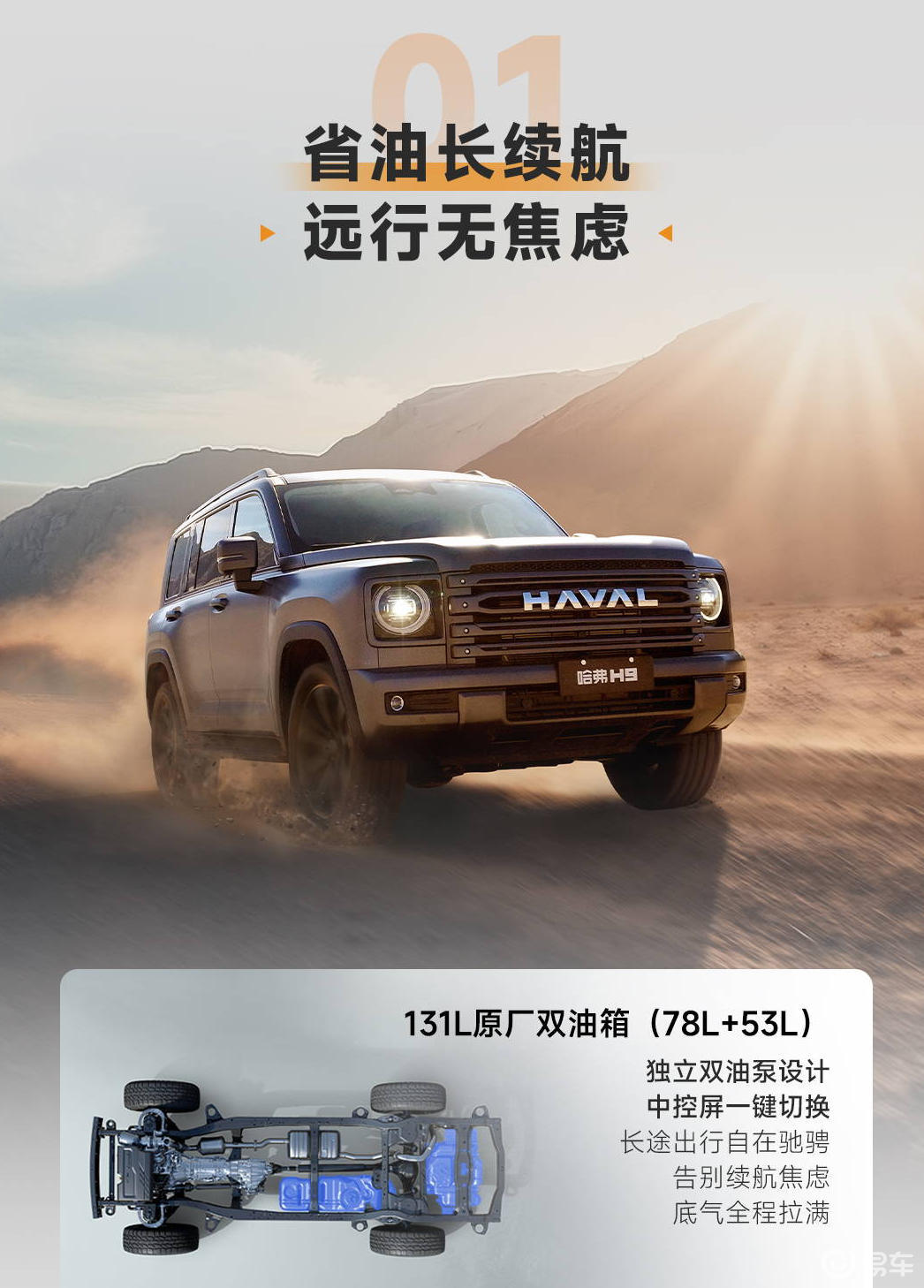 在用户极为关注的续航方面,二代哈弗H9穿越版搭载了131L双油箱,满油状态下综合续航可达1400km,能够轻松覆盖绝大多数长穿路线。其高效柴油动力系统表现出色,百公里油耗仅9.3L,有效降低了出行成本。在可靠性上,柴油动力具有预热快、高温散热高效的优势,能够适应高原低温等极端环境。而且,长城汽车的多项专利技术为车辆品质提供了坚实保障。同时,新车全系标配“三把锁”、AT越野轮胎,拥有9种驾驶模式,车姿抬高30mm后空载最小离地间隙达235mm,还自带2.5吨牵引资质,将高端越野车的顶配配置变成了普通用户的标配福利。