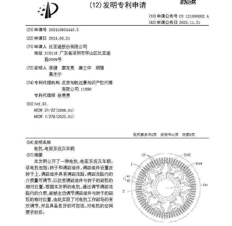 比亚迪提出的可变磁通电机技术,为电动车动力系统带来了新的思路。与传统永磁同步电机不同,该技术通过在转子上加装调磁组件,利用液压、电控或弹簧系统改变组件与磁极的相对位置,从而动态调整转子的工作磁场。这种设计无需外接齿轮机构,即可实现转速、功率和扭矩的精准调校,相当于将“变速器”集成到电机内部。