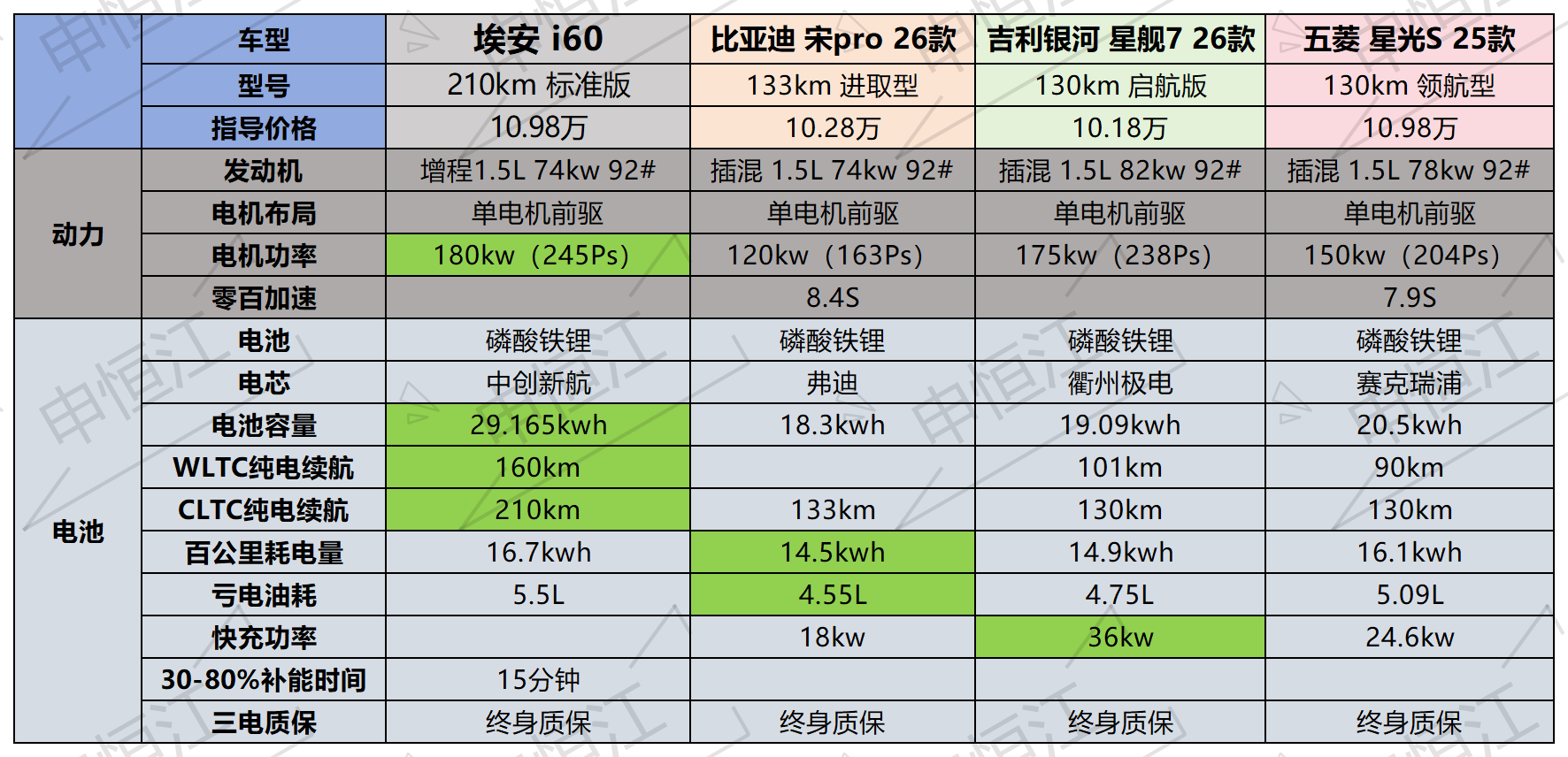 三电系统是混动车型的核心。埃安i60搭载180kW电机,动力最强,CLTC纯电续航达210公里,电池容量29度;星舰7和星光S电机功率分别为175kW和150kW,纯电续航130公里;宋Pro电机功率120kW,纯电续航133公里。能耗表现上,宋Pro以百公里14.5度电和4.55L亏电油耗最优,星舰7紧随其后,星光S和埃安i60则相对较高。四款车均提供三电终身质保。