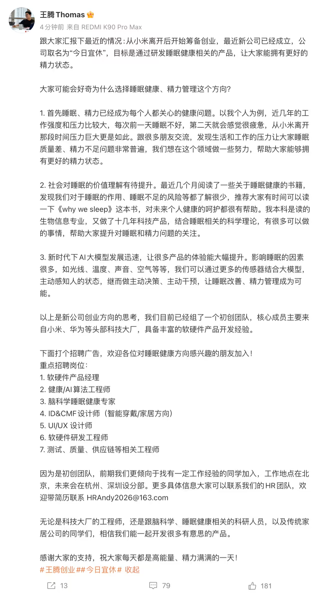 原小米中国区市场部总经理、REDMI品牌负责人王腾近日通过社交平台宣布,其创业项目已进入实质筹备阶段。新成立的科技公司命名为“今日宜休”,将聚焦睡眠健康领域,致力于通过智能硬件与AI技术改善用户的精力管理状态。