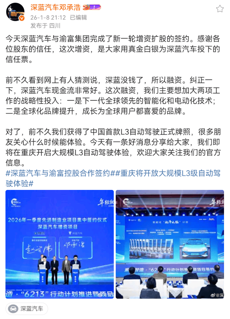 近日,深蓝汽车与重庆渝富控股集团正式签署新一轮增资扩股协议,后者将向深蓝汽车注入25亿元发展资金。针对外界关于“深蓝因资金短缺而融资”的猜测,深蓝汽车董事长邓承浩公开回应称,公司现金流状况稳健,此次融资旨在加速战略布局而非填补资金缺口。