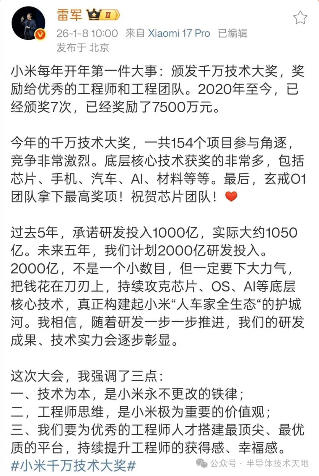 在颁奖典礼现场,小米集团董事长雷军亲自为研发团队授奖。他特别指出:“玄戒O1的市场反馈超出预期,用户和专业媒体给予高度评价,这支年轻团队用实力证明了中国工程师的创新能力。”据技术白皮书披露,该芯片在复杂场景下的能效比提升达40%,AI运算速度较前代产品提升3倍,为智能手机、智能汽车等终端设备提供强大算力支撑。