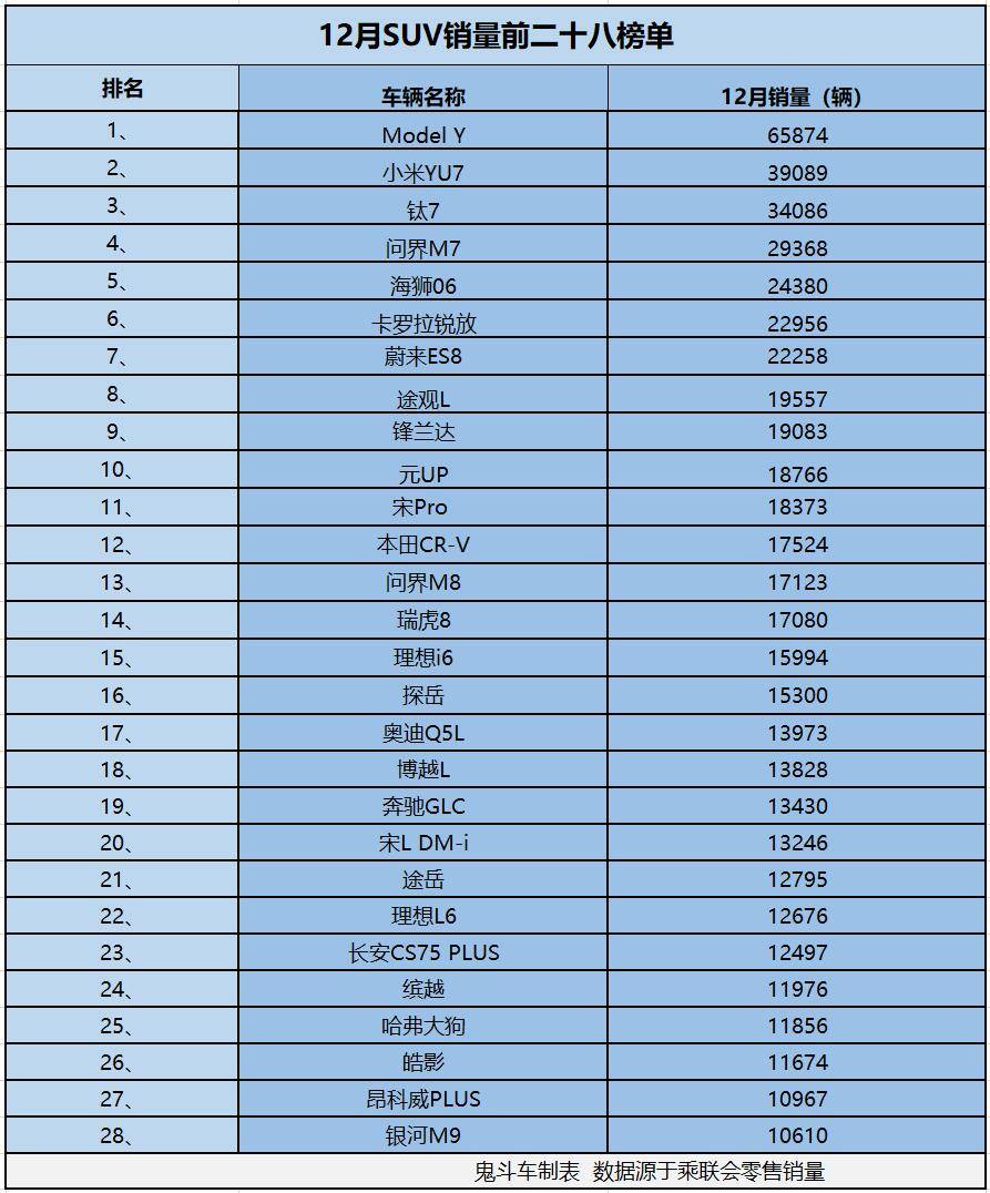 2025年12月的SUV零售市场数据正式公布,尽管整体消费市场呈现疲软态势,但SUV细分领域依然展现出强劲活力。乘联会数据显示,当月共有28款SUV车型销量突破万辆大关,其中新能源车型与个性化产品成为市场亮点。