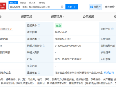 - 国家电投集团等在盐城成立海上风力发电公司 注册资本5亿